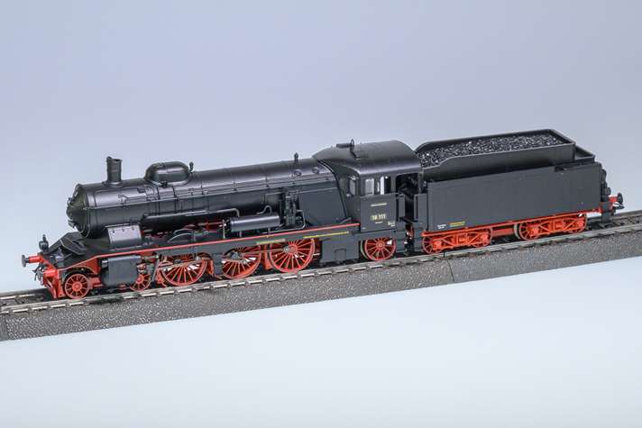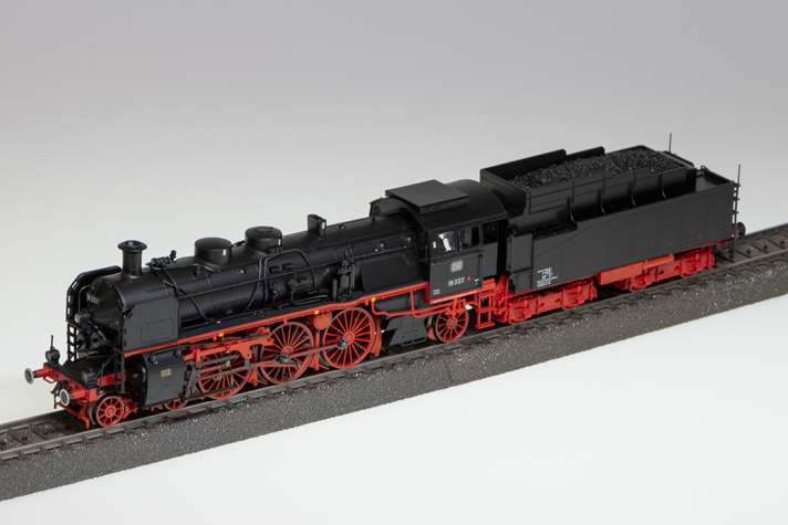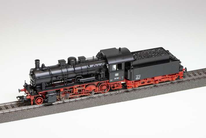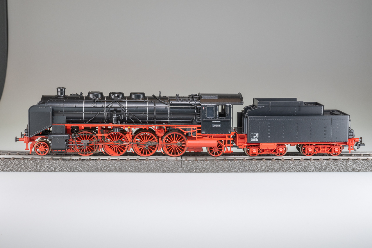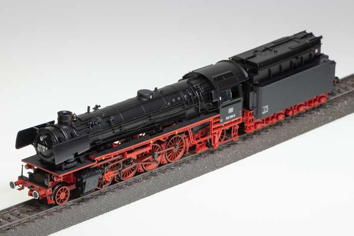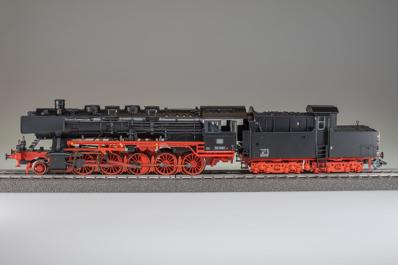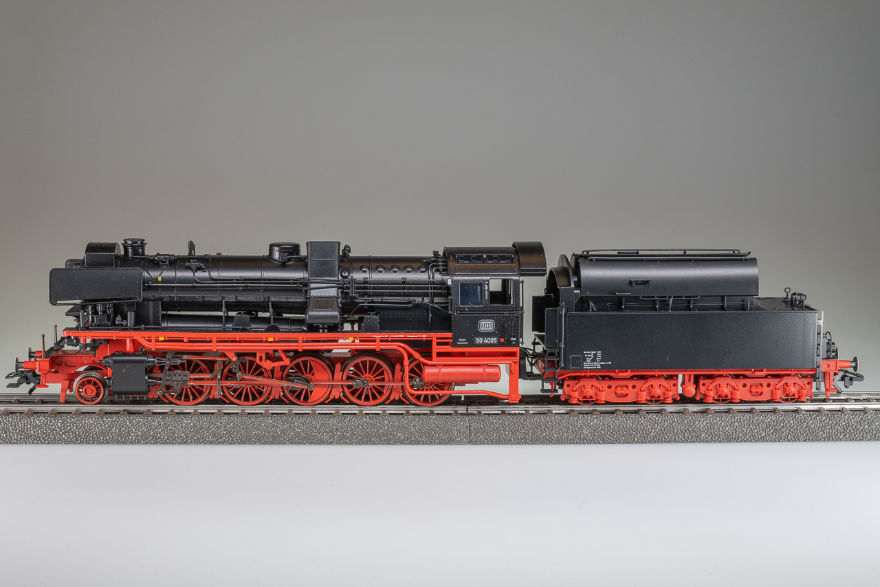 Güterzug-Dampflokomotive Baureihe 50.40 der Deutschen Bundesbahn (DB). Umbauversion mit Neubau-Hochleistungskessel und Franco-Crosti-Rauchgasvorwärmer, Witte-Windleitbleche, DB-Reflexglaslampen, auf dem Umlauf stehend angeordnete Sandkästen, seitlich angesetzter Schornstein und umgebauter Schlepptender 2´2´T 26 mit Kohlenkasten-Abdeckklappen. Betriebsnummer 50 4005. Betriebszustand um 1962.
