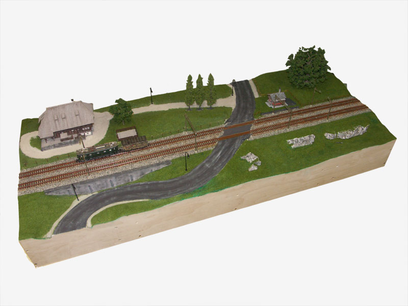 Das Modul bekam als Highlight einen Bahnübergang. Nach langem Suchen hattee ich einen mit Schranken, welche lang genug waren gefunden. Der Bausatz für den Übergang stammte von Weinert. So fein detailliert die Einzelteile auch sind, der Zusammenbau war eine Riesenfummelei! Auf den Bildern ist er noch nicht zu sehen, da er gerade in der Lackierung war (auch das muss man selber machen!).