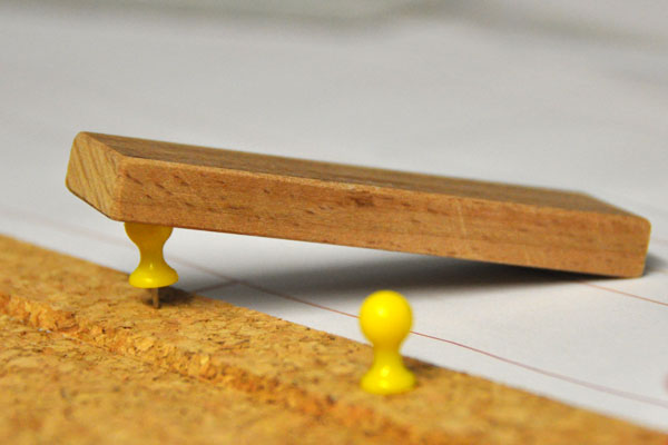Für die Befestigung der Korkstreifen für den Gleiskörper nimmt man mit Vorteil stabile Pinnwandnadeln. Diese lassen sich auch durch die erste Korkschicht in das darunterligende Holz drücken. Dazu ist ein recht hoher Kraftaufwand nötig.