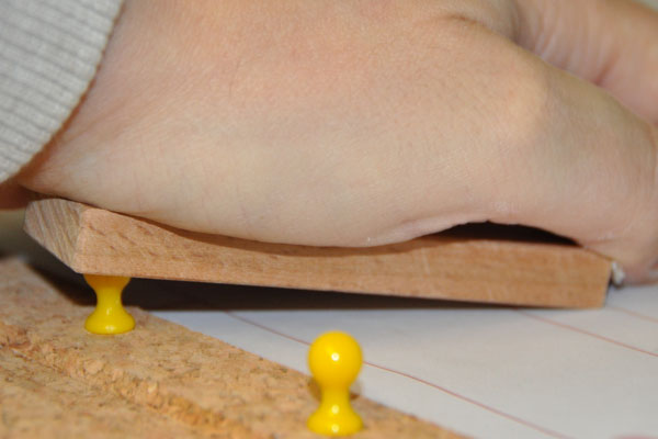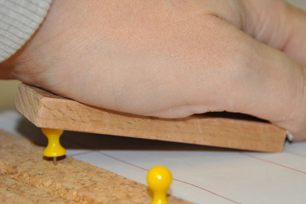 Man nimmt sich ein kleines Stück einer Hartholzleiste, bohrt mit einem Holzbohrer zwei, drei Milimeter tief ein Loch und schon ist der «Pindrücker» fertig!