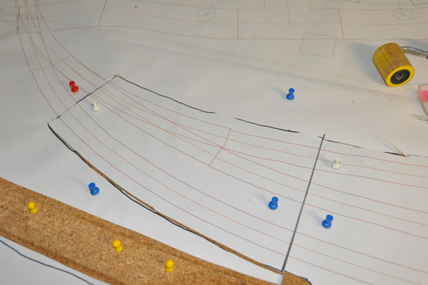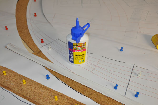 Wie bringt man aber nun die Korkstreifen möglichst exakt an? Auch hier geht es wieder "Step by Step!". Die vorher ausgeschnittenen Planteile werden dafür wieder an ihrem Platz fixiert.