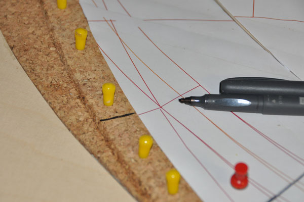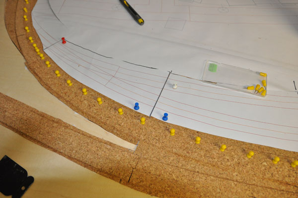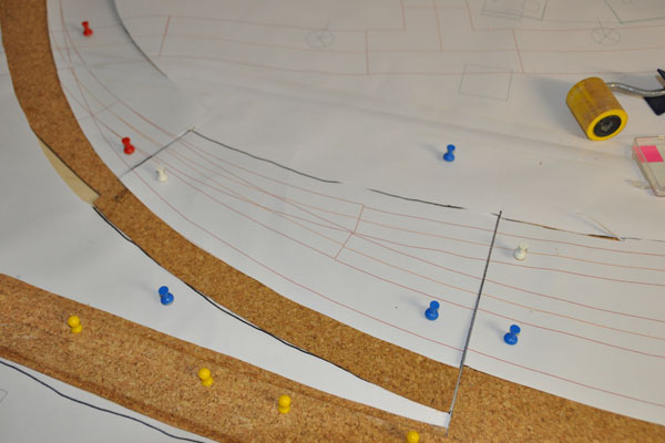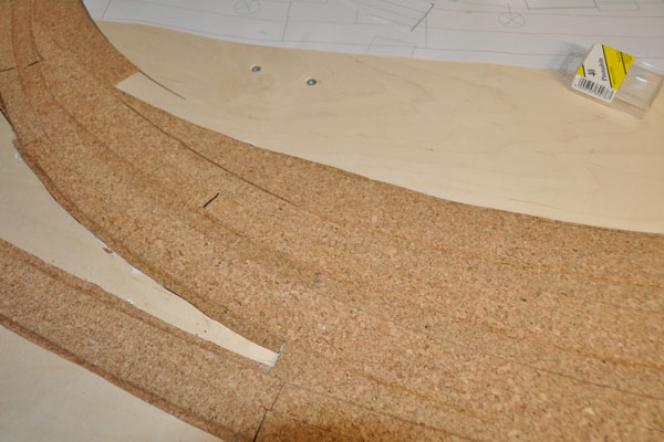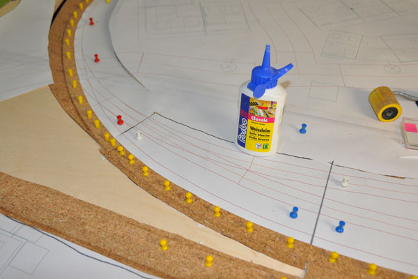 Ist die vordere Hälfte des Korkbettes verlegt, wird ein weiteres Stück vom Plan weggeschnitten.