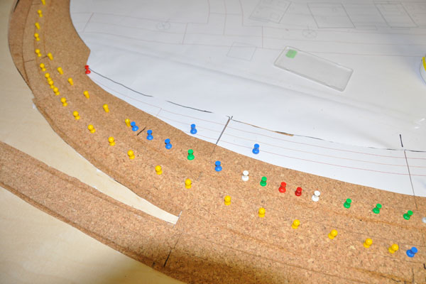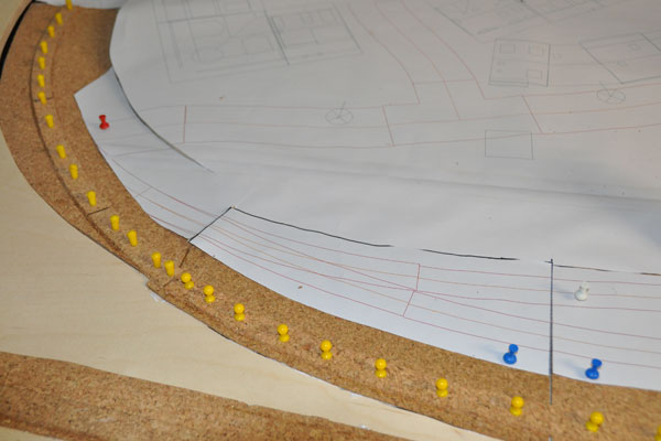 Die Lösung für dieses Problem lautet: "Step by Step!". Zuerst wird der Plan mit Pinnwandnadeln fixiert. Danach schneidet man Stück für Stück aus, legt es als Schablone auf die Korkplatte und klebt diese gleich in die entstandene Lücke im Plan ein. So arbeitet man sich von einer Seite bis zur anderen und hat am Ende die erste Schicht Kork verlegt.