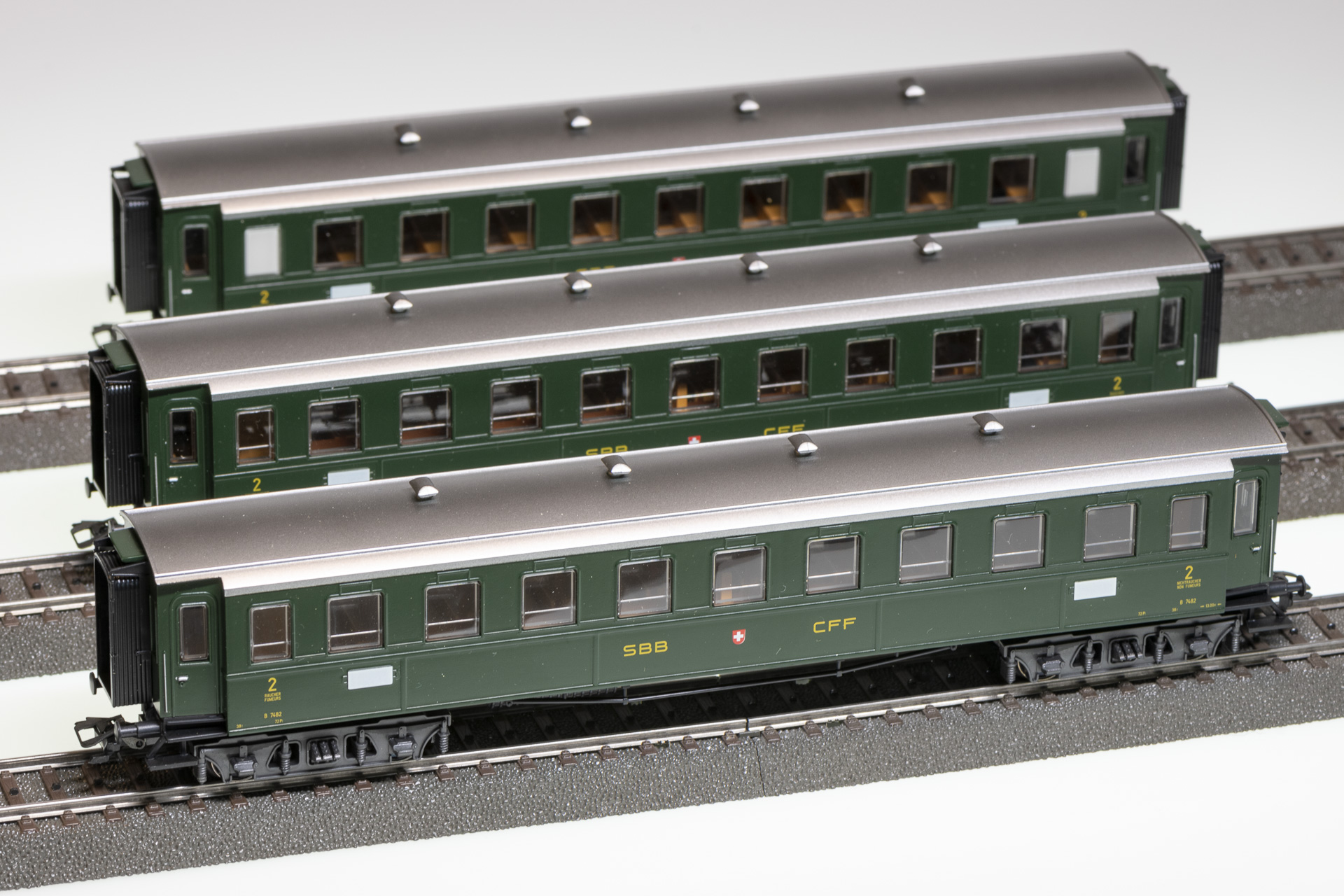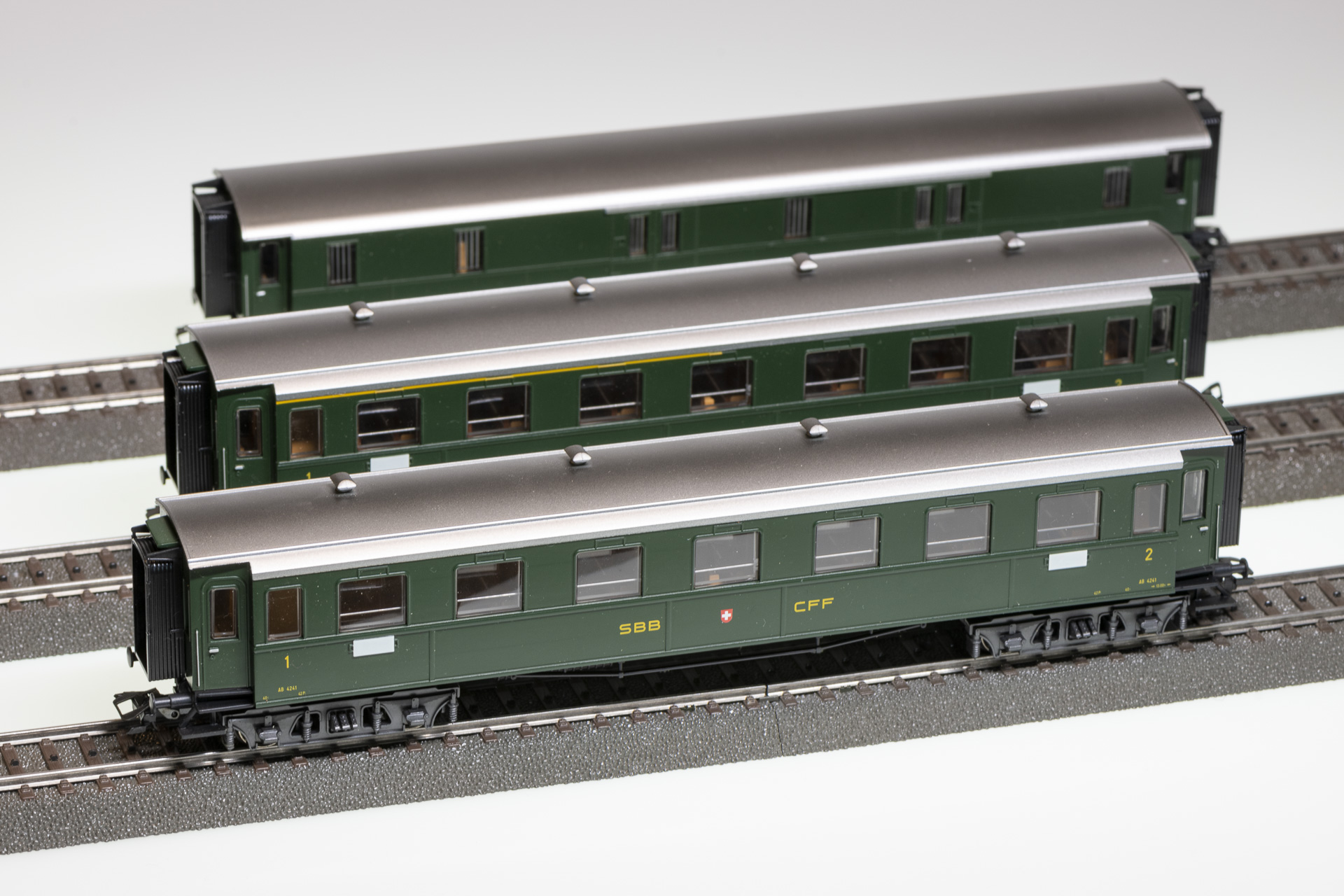 3 Schnellzugwagen älterer Bauarten der Schweizerischen Bundesbahnen (SBB).